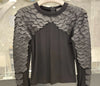 This black long-sleeve statement top is detailed with layered faux leather scale accents across the shoulders and sleeves, creating a bold, sculpted look that’s equal parts fierce and futuristic.